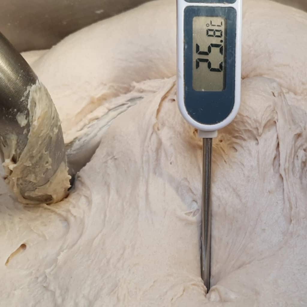 Et oui, c’est une habitude indispensable : TOUJOURS PRENDRE LA TEMPÉRATURE DE SA PÂTE A LA FIN DU PÉTRISSAGE. En plus de permettre de régler sa température de base, cela permet de savoir s’il faut ajuster le temps de pousse !