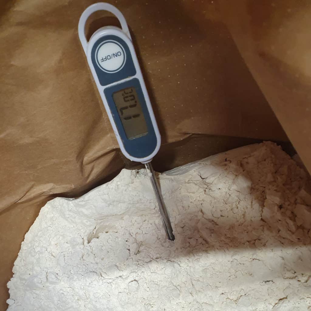 Et oui, c’est une habitude indispensable : TOUJOURS PRENDRE LA TEMPÉRATURE DE SA PÂTE A LA FIN DU PÉTRISSAGE. En plus de permettre de régler sa température de base, cela permet de savoir s’il faut ajuster le temps de pousse !